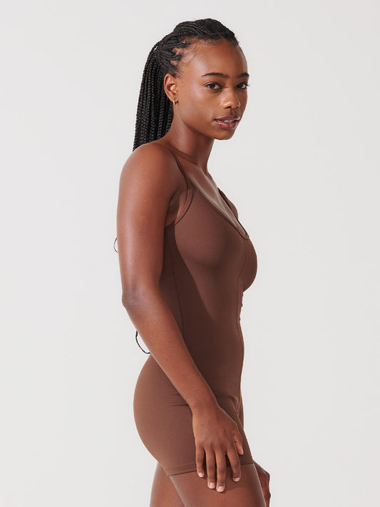 Macaquinho Fitness Modelador com Decote V e Alças Finas Marrom Cacau