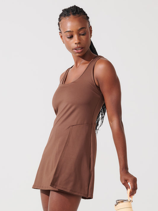 Vestido com Detalhe em Sobreposição e Shorts Interno Marrom Cacau
