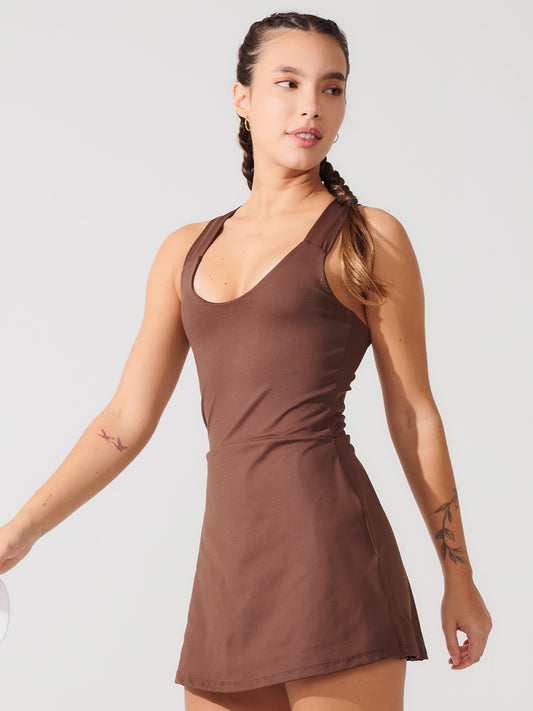 Vestido Fitness Modelador com Sustentação, Costas Nadador e Shorts Marrom Cacau