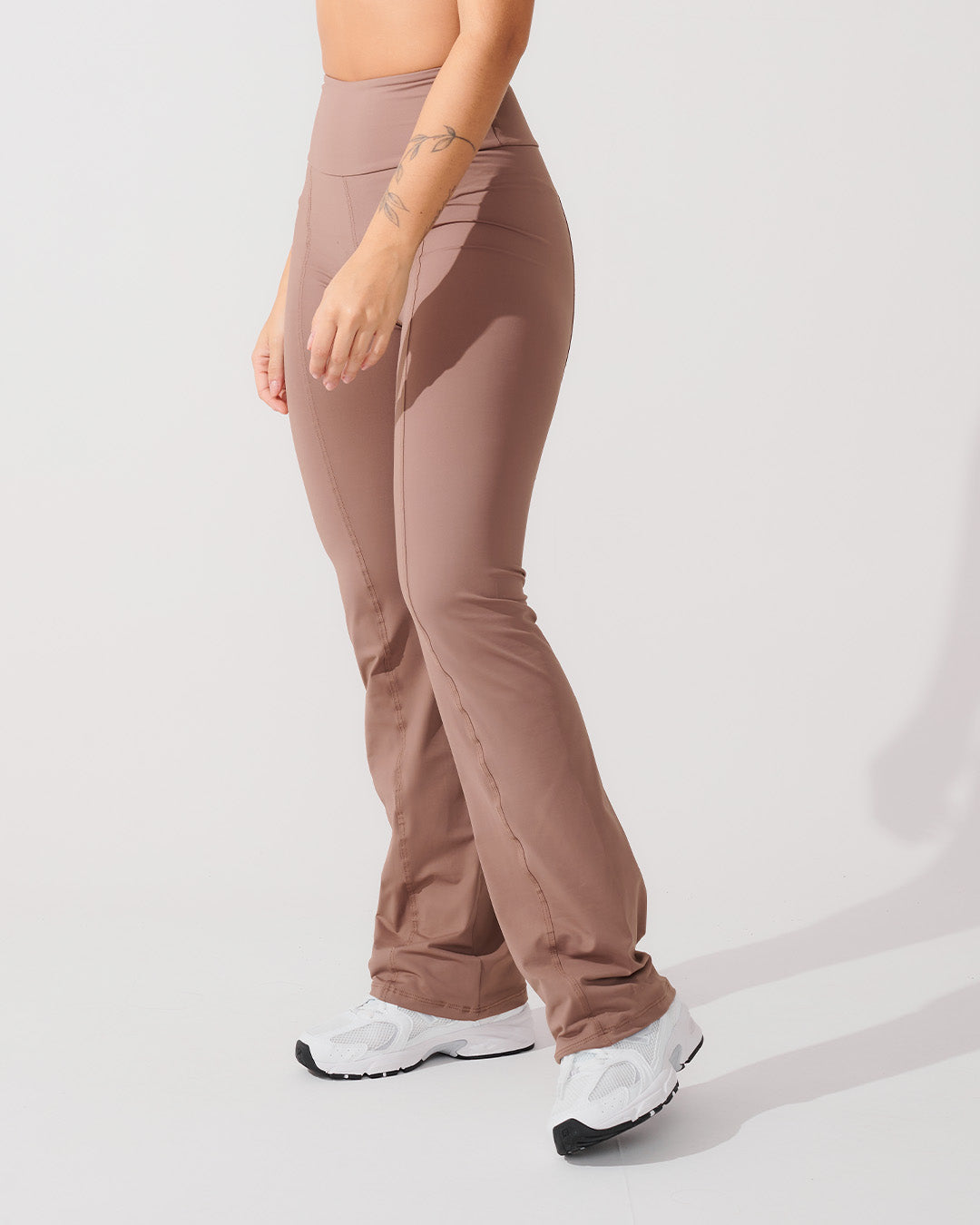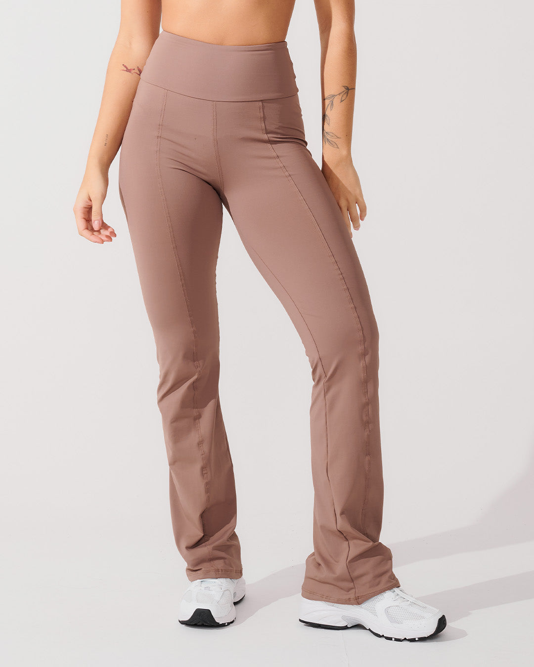 Calça Flare Bailarina Marrom Cacau com cintura alta em tecido duplo, sem transparência. Sua compressão média e toque extra macio envolvem o corpo em um abraço aconchegante, permitindo que você se exercite com conforto e segurança.