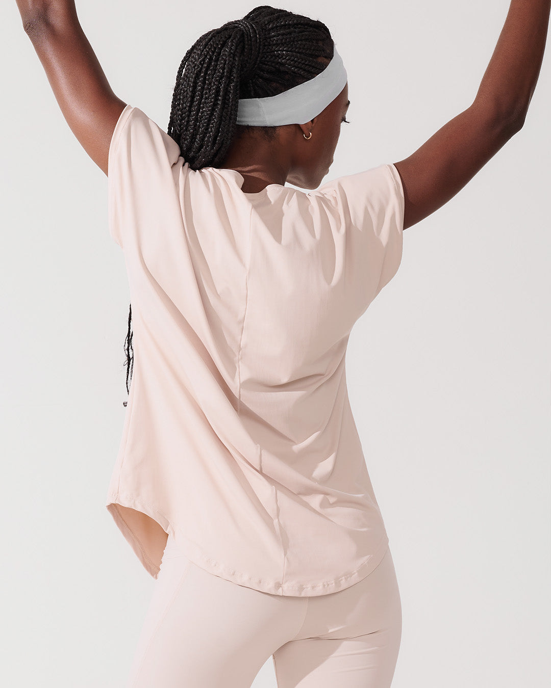 T-Shirt Essencial Alongada com modelagem cavada favorece a respirabilidade e garante liberdade de movimento durante os treinos. Para quem busca mais sustentação, é perfeita para ser usada com top por baixo. Feita em tecido leve, conta com manga curta e gola redonda, além de um comprimento alongado que cobre o quadril, oferecendo mais conforto, discrição e segurança ao se exercitar.