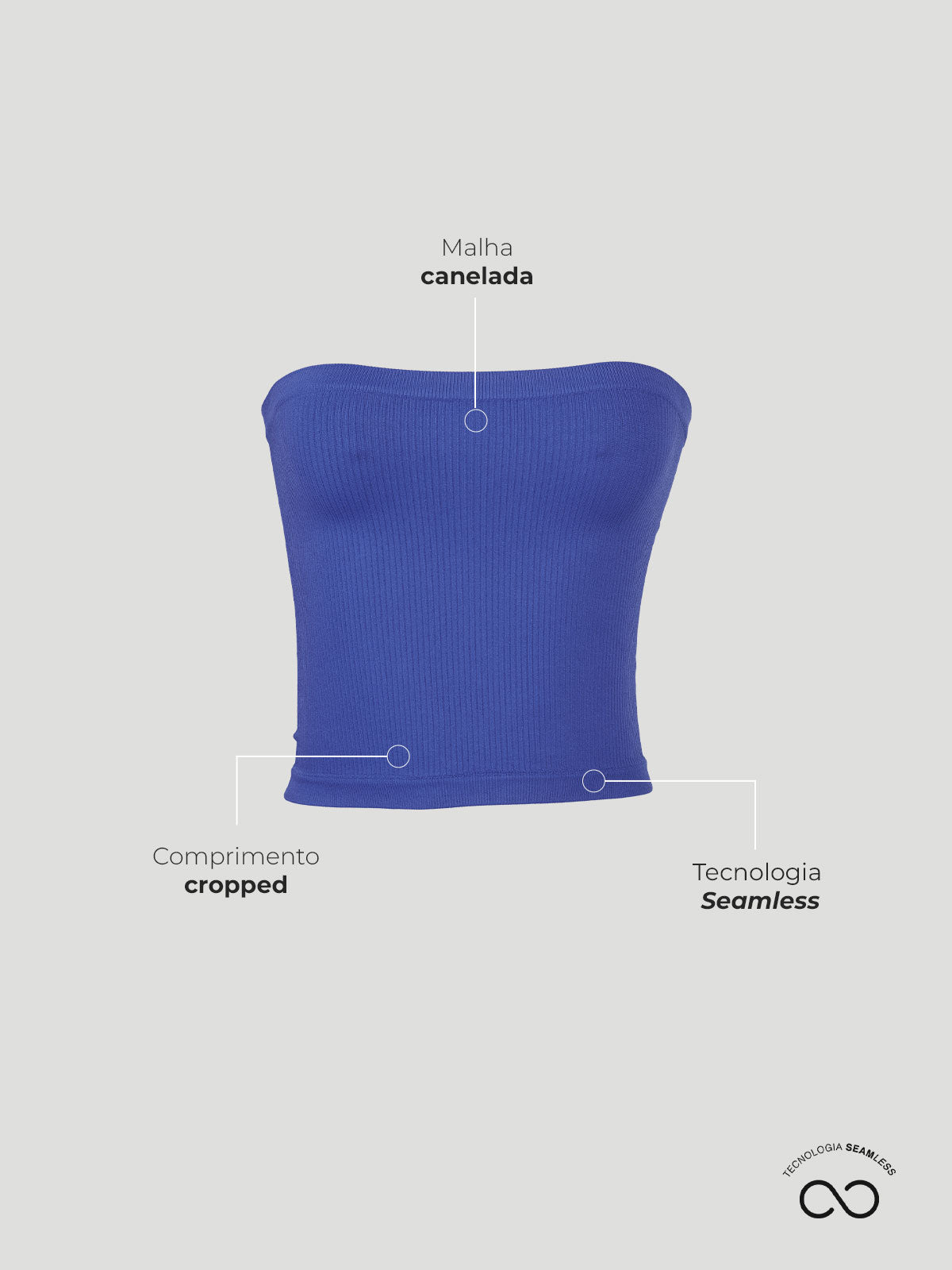 Top tomara-que-caia de tecido canelado sem costura. Com modelagem cropped e comprimento até o umbigo, combina facilmente com saias, shorts e calças, permitindo várias composições. É a peça queridinha do momento, agradando desde as mulheres básicas às mais fashionistas por sua versatilidade e conforto.